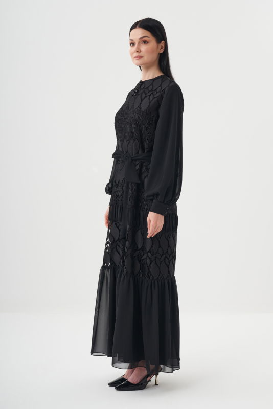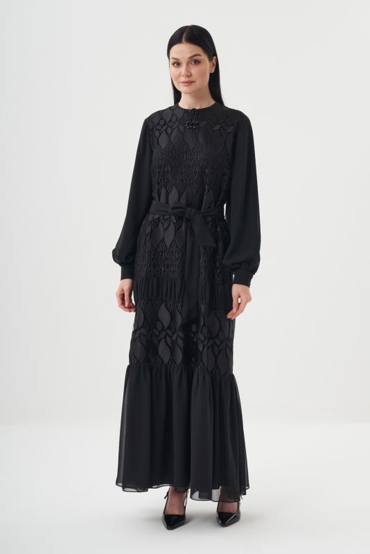 Dantelli Pile Detaili Şik Elbise SİYAH