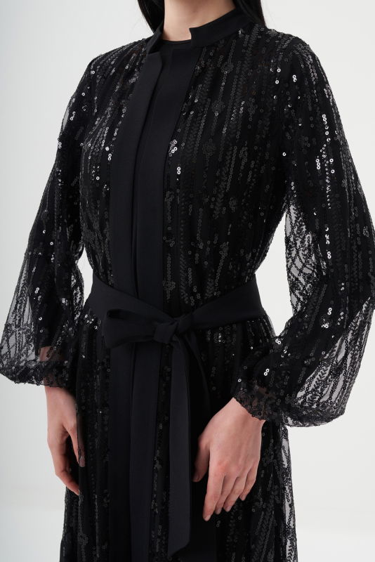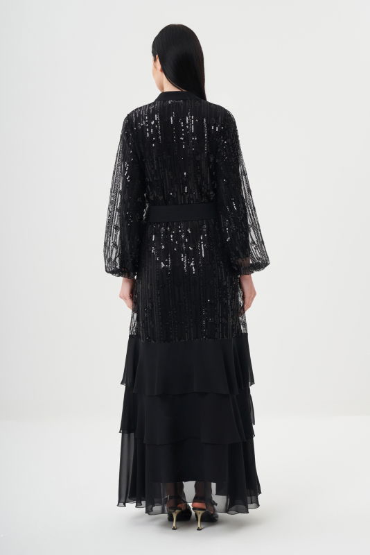 Payetli Şifon Volanlı Şik Abaya SİYAH
