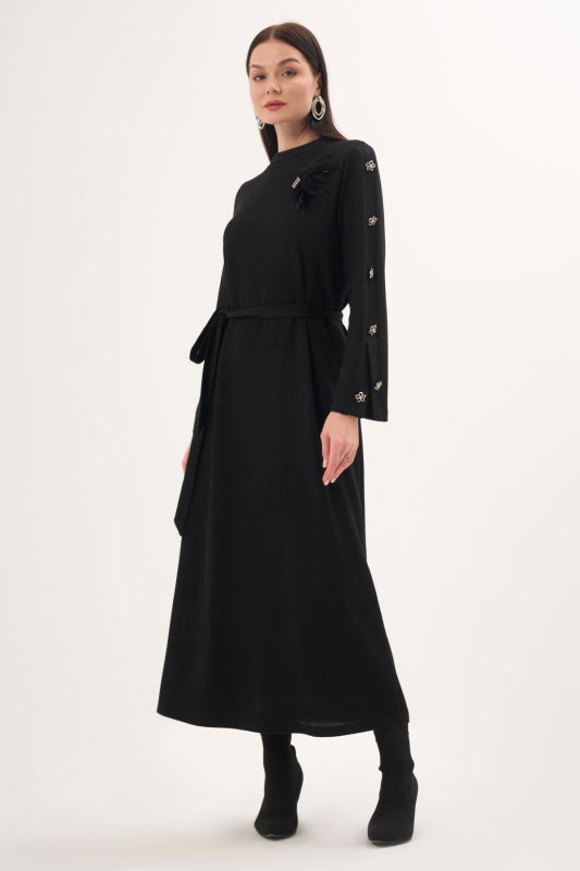 Dantelli Pile Detaili Şik Elbise SİYAH