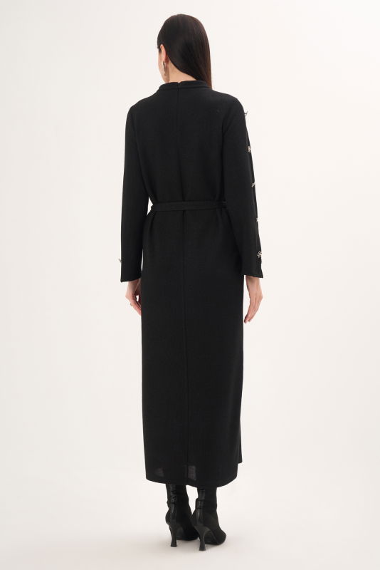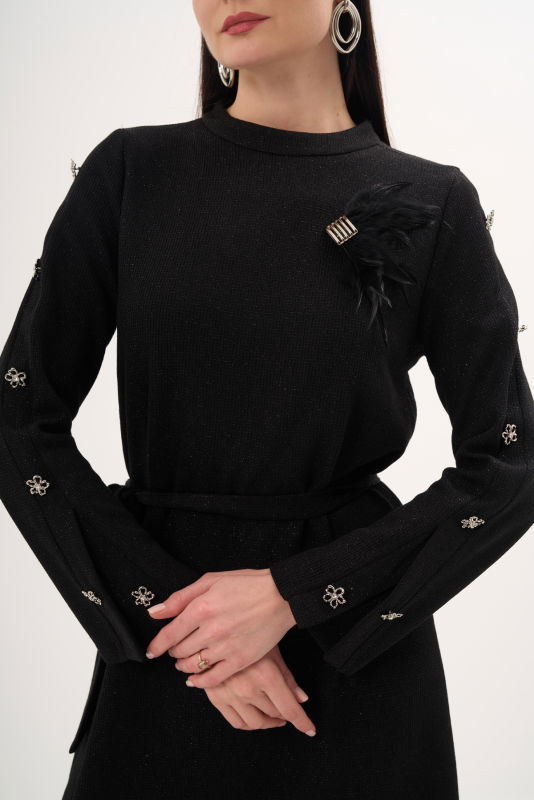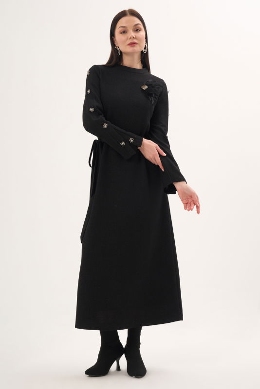 Örme Deri Detaili Nakışlı Elbise SİYAH
